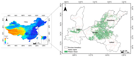 The study area encompasses China’s Huang-Huai-Hai wheat region, the middle and lower reaches of the Yangtze River wheat region, and the Northwest wheat region, spanning four major provinces for winter wheat cultivation: Henan, Shandong, Anhui, and Shaanxi. Each of these wheat-growing regions exhibits unique climatic conditions. The wheat-growing areas in the Huang-Huai-Hai region feature a warm temperate monsoon climate, characterized by cold and dry winters, hot and rainy summers, and occasional severe spring droughts. The wheat fields located in the middle and lower reaches of the Yangtze River are influenced by a north subtropical humid monsoon climate, with mild winters and moderate rainfall, followed by hot summers with abundant precipitation. Precipitation is generally plentiful and relatively evenly distributed throughout the year. In the Northwest wheat region, the climate of Shaanxi Province is particularly diverse. The southern part of Shaanxi has a northern subtropical climate that is humid and rainy, whereas Guanzhong and most areas in northern Shaanxi have a warm temperate climate that is semi-humid or semi-arid. Despite the varying climatic conditions across these wheat-growing regions, they all offer suitable temperatures, sufficient rainfall, and adequate sunlight, providing an optimal environment for wheat growth. Winter wheat is typically sown in autumn and harvested in May of the following year. In the winter wheat-growing regions, following the harvest, crops such as corn are often cultivated as subsequent plantings. As illustrated in Figure 1, winter wheat is primarily distributed in central Shaanxi Province, most of Henan Province, central and southern Shandong Province, and northern Anhui Province.