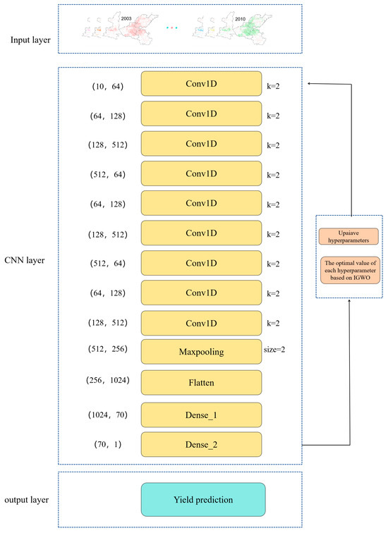 Figure 2. Network architecture of the CNN model enhanced with improved Gray Wolf Optimizer for winter wheat yield prediction.
