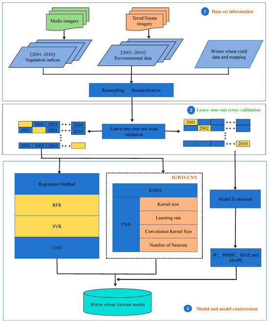 In deep learning models, parameter adjustment directly impacts the algorithm’s accuracy. Manual parameter tuning is not only time-consuming but also often fails to achieve high-precision results [15]. To address this challenge, optimization algorithms have been introduced. These algorithms automatically adjust parameters through numerous simulation experiments, ensuring that the model parameters attain an optimal state [16]. Furthermore, the incorporation of optimization algorithms significantly enhances the model’s stability and generalization ability. Optimization algorithms encompass various aspects, such as solving optimization problems, improving efficiency, handling complexity, and tackling large-scale issues [17,18]. In a study by Guo et al. [19], the Improved Particle Swarm Optimization Algorithm (IPSO)-BPNN was employed to predict winter wheat yield in the Guanzhong Plain of China. The results demonstrated a significant improvement in prediction accuracy, further validating the immense potential of optimization algorithms in the field of yield forecasting. The Improved Gray Wolf Optimizer (IGWO) has exhibited excellent performance in numerous prediction tasks [20]. Belonging to the category of swarm intelligence-based algorithms [21], IGWO boasts powerful global optimization capabilities, efficient search performance, precise parameter optimization, and reliable dynamic adjustment strategies [22]. Since the IGWO had not yet been extensively applied to crop yield forecasting, and specifically, the IGWO with Convolutional Neural Networks (CNN), the IGWO-CNN model, had not been utilized to predict winter wheat yield, we elected to assess the predictive performance of the IGWO-CNN model using a dataset encompassing ten years.
