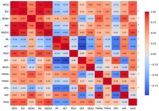 Figure 4. Inter–Variable and yield correlation heatmap with significance indicators. The * indicates that the correlation coefficient (r) has a p–value less than 0.001, which suggests a very high level of statistical significance for that particular correlation.