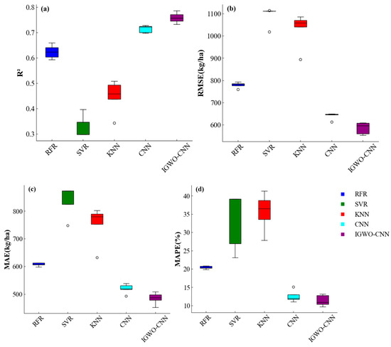 Figure 5. Comparison of predictive performance among five models using (a) R2, (b) RMSE, (c) MAE, and (d) MAEP metrics; white circles indicate errors.