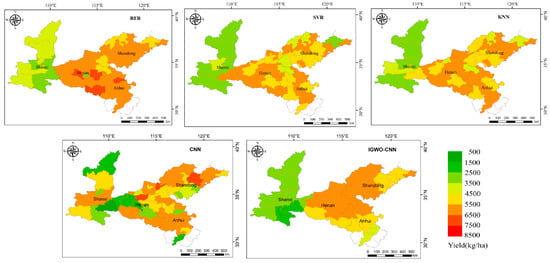 Figure 8. Spatial pattern of winter wheat yield predictions for 2007 based on RFR, SVR, KNN, CNN, and IGWO-CNN models.