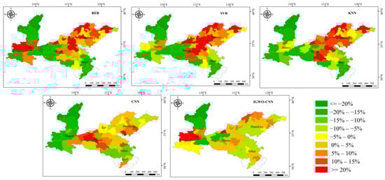 We used five models to map the spatial distribution of winter wheat yield in the study area, as depicted in Figure 8. By combining official statistical data from 2001 to 2010, we found that the prediction results for 2007 were the most accurate. Therefore, we focused on comparing the predictions of the five models for the spatial distribution of winter wheat yield in 2007. Observing the data presented in the figure, it is evident that cities with higher winter wheat yields are primarily concentrated in Shandong Province, Anhui Province, and Henan Province. Conversely, cities with lower winter wheat production are mainly located in Shaanxi Province. We further analyzed the predicted yield data and plotted error graphs for the five models, as shown in Figure 9. The results indicated that the CNN and IGWO-CNN models exhibit the smallest prediction errors, with the IGWO-CNN model performing the best. The IGWO-CNN model tended to slightly underestimate the yields, but the error is minimal, and its prediction results are the closest to the statistical data. This excellent performance may be attributed to the incorporation of the optimization algorithm. In contrast, the prediction results of RFR, SVR, and KNN show a tendency to overestimate yields in high-producing areas and underestimate yields in low-producing areas. Additionally, the error analysis reveals that the RFR, SVR, and KNN models have larger errors compared to the IGWO-CNN model.