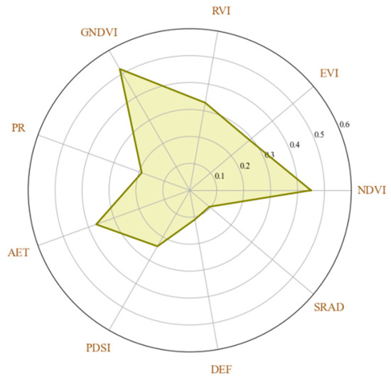 We aimed to thoroughly analyze the contribution of each indicator to winter wheat yield prediction within the IGWO-CNN model. A wind rose diagram (Figure 12) was employed to elucidate the significance of vegetation indices and environmental variables in predicting winter wheat yield. The diagram clearly depicts the weight of each factor in the prediction model, allowing for an intuitive understanding of their impact on the forecasted winter wheat yield. Our analysis revealed that GNDVI made the most substantial contribution to the forecasting process, with an importance score of 0.5204, further affirming its pivotal role in winter wheat yield forecasting. The second most influential indicator was NDVI, which scored 0.4523 in importance. NDVI primarily reflects changes in crop biomass, which, in turn, mirror the production capacity and health status of the crop. Additionally, among the environmental data, AET and PDSI exhibited the highest contributions, with importance scores of 0.3712 and 0.2461, respectively, highlighting the crucial role of environmental factors in the prediction process.