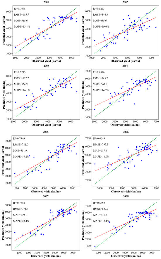 Figure 7 depicts the correlation between the measured yield and the predicted yield of winter wheat for each year using the IGWO-CNN model with the leave-one-year-out method. To assess the prediction accuracy of the measured versus predicted yield, a y = x diagonal line has been included in the figure. The proximity of the data points in Figure 7 to this diagonal line serves as an indicator: the closer a point lies to the y = x line, the higher the concordance between the predicted yield and the measured yield. By analyzing the predicted output for the decade spanning from 2001 to 2010, we observed that, with the exception of 2002, the prediction accuracy for the other years was above 0.6. Specifically, in the years 2001, 2003, 2005, 2007, and 2009, the prediction results were optimal, with accuracy levels surpassing 0.7. The points representing the measured and predicted yields were evenly and densely distributed around the y = x line. This indicates that the predictions were highly accurate and reliable during these years, as the closeness of the points to the y = x line suggests a strong correlation between the predicted and actual yields. Among these five years, the best linear fitting effect was observed in 2007, with an R2 value of 0.7394, RMSE of 774.3, MAE of 579.1, and MAPE of 23.4%. This may be attributed to two factors: firstly, we incorporated multiple feature extractions when constructing the model and discarded some unimportant features in the process; secondly, the incorporation of the optimization algorithm significantly enhanced the model’s predictive capability.