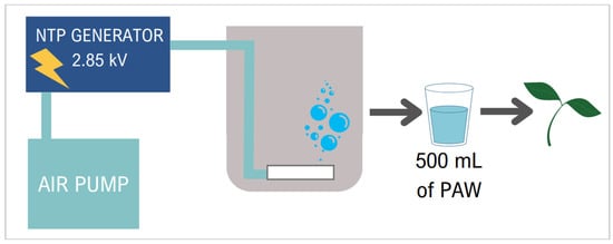 Previous studies have demonstrated the beneficial effects of cold plasma on seed germination and plant growth [12]. Additionally, NTP technology has proven effective in the post-harvest stage, enhancing product quality preservation and maintenance through disinfection and sanitization [13,14,15]. This application, referred to as NTP-treated water or plasma-activated water (PAW), has shown promising results in promoting plant health, sturdiness, and root development, thereby enhancing growth performance and reducing the need for fertilizers and plant protection products against biotic stresses [16,17].