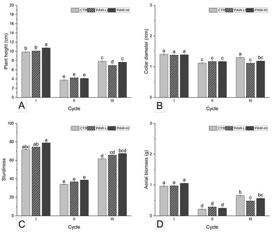 Effects of cultivation cycle (I cycle: May–June; II cycle: June–July; III cycle: September–October) and plasma-activated water treatment (CTR: control; PAW-LI: low-intensity; PAW-HI: high-intensity) on plant height (A), collar diameter (B), sturdiness index (C), and aerial biomass fresh weight (D) in Swiss chard. Different letters indicate significant differences (p < 0.05) between treatments according to Tukey’s HSD test.