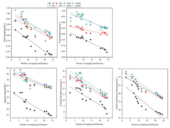 | Treatment | Total Nitrogen (g Kg−1) | Total Phosphorus (g Kg−1) | Organic Matter (g Kg−1) | Available Phosphorus (mg Kg−1) | Alkaline Hydrolysis Nitrogen (mg Kg−1) |