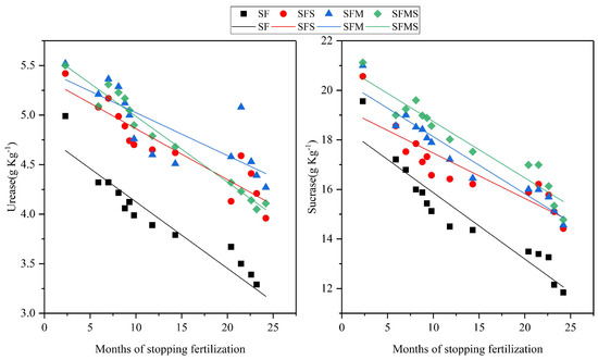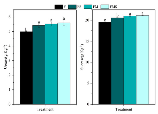 | Treatment | Urease (g Kg−1) | Sucrase (g Kg−1) | ||||||