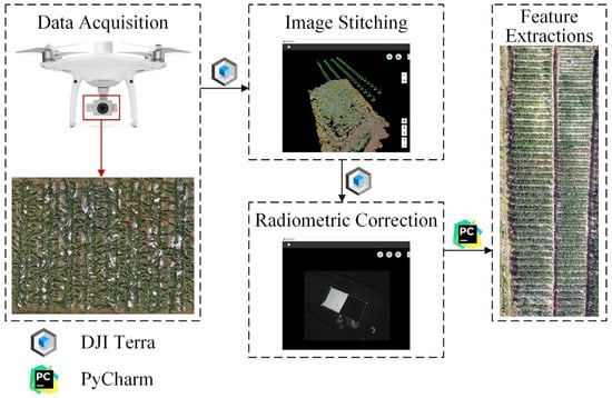 Data collection was conducted during key maize growth stages, namely the jointing stage (17 July 2023), tasseling stage (3 August 2023), and grouting stage (17 August 2023), between 12:00 and 14:00. On 17 July, from 12:00 to 14:00, the temperature ranged from 28.08 °C to 29.39 °C with no precipitation. Horizontal surface radiation ranged from 922.99 W/m2 to 943.99 W/m2, and ground wind speed varied from 0.869 m/s to 1.145 m/s. On 3 August, from 12:00 to 14:00, the temperature ranged from 24.06 °C to 25.56 °C, with precipitation amounts in the range of 0.459 mm to 0.338 mm. Horizontal surface radiation ranged from 647.49 W/m2 to 797.24 W/m2, and ground wind speed varied from 1.449 m/s to 0.835 m/s. On 17 August, from 12:00 to 14:00, the temperature ranged from 26.64 °C to 27.55 °C with no precipitation. Horizontal surface radiation ranged from 865.74 W/m2 to 836.49 W/m2, and wind speed varied from 0.870 m/s to 1.145 m/s. The remote sensing data processing flow is shown in Figure 2. Flight paths were designed using DJI GS PRO 2.0.17 software. To ensure high-quality digital orthophoto maps of the study area, appropriate forward and side overlap rates were essential. The flight parameters were configured as follows: an altitude of 15 m, a speed of 2 m/s, a forward overlap of 80%, and a side overlap of 70%.