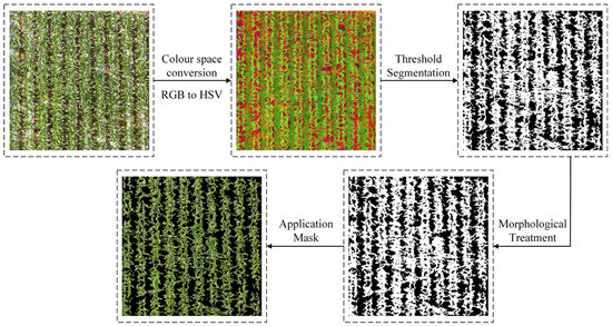 To improve the accuracy of subsequent analyses and reduce the interference of environmental factors, we employed an image segmentation method based on color thresholding and morphological processing to remove the background from UAV-captured maize canopy images, retaining only the maize plants (Figure 3). First, the original image was converted to the HSV color space to more accurately extract the green areas of the plants. By setting the green low threshold to (35, 40, 40) and the green high threshold to (85, 255, 255), the InRange function was used to extract the maize plant portion, generating a binary mask. Next, morphological operations (opening and closing) were applied to the mask image to remove noise and fill any gaps, thereby accurately extracting the plant regions. Finally, the morphologically processed mask was applied to the original image, using a bitwise AND operation to retain only the plant regions and remove the background. This method does not require complex model training, offering high efficiency and flexibility, making it suitable for image processing under varying lighting and environmental conditions.