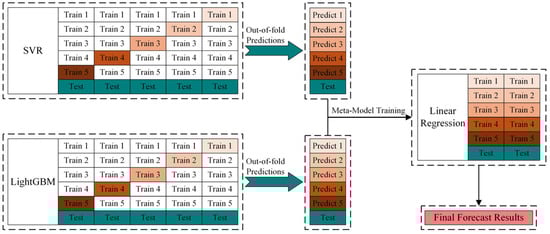 Support Vector Regression (SVR) fits data by identifying an optimal hyperplane in a high-dimensional space, demonstrating strong robustness in handling nonlinear relationships within such spaces [43]. However, the performance of SVR can be influenced by parameter selection, particularly when dealing with complex datasets [44,45]. The SVR model was optimized by conducting a grid search over the key hyperparameters, including the kernel type, regularization parameter (C), and the kernel coefficient (gamma). The kernel used in this study was the radial basis function (RBF) due to its ability to handle nonlinear relationships effectively. LightGBM, a gradient-boosted decision tree model [46], was fine-tuned using random search. Regularization parameters, including L1 and L2 penalties, were adjusted to prevent overfitting, and the minimum child weight and maximum depth parameters were optimized to reduce model complexity. Out-of-fold (OOF) predictions were generated and used as features, which were then input into the meta-model for final prediction. We selected a linear regression model with L2 regularization as the meta-model. During training, five-fold cross-validation divides the dataset into five subsets. Each base model is trained on four subsets and generates OOF predictions on the remaining subset. The OOF predictions from all five folds are then aggregated into a new feature matrix, which serves as input to the meta-model. This ensures the unbiasedness and reliability of the OOF predictions, preventing data leakage into the final model. By learning the combinatorial relationships among these predictions, this approach further enhances the overall predictive performance. This methodology effectively combines the strengths of SVR and LightGBM, better accommodating the characteristics of complex datasets and improving both the predictive accuracy and reliability of the model. The stacking ensemble learning process is shown in Figure 5.