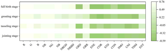 A Pearson correlation analysis was conducted to evaluate the relationship between each selected color and texture feature and the maize canopy CHL content individually (Figure 6). The results indicate that NR, NG, R, G, and B showed relatively high correlations with the CHL content during the jointing, tasseling, grouting, and full birth stages. Specifically, the correlation between NR and the CHL content ranged from 0.631 to 0.696, that between NG and the CHL content ranged from 0.667 to 0.755, that between R and the CHL content ranged from 0.631 to 0.725, hat between G and the CHL content ranged from 0.503 to 0.696, and that between B and the CHL content ranged from 0.50 to 0.70. These features effectively monitor the canopy CHL content. Features with absolute correlation coefficients greater than or equal to 0.3 were selected as input variables for the model.
