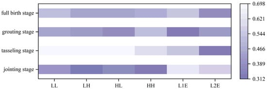 In this study, DWT effectively extracted both global and local features, enabling the model to capture overall trend information (e.g., canopy color and light uniformity) as well as local details (e.g., leaf edges and texture variations). The decomposition process is illustrated in Figure 11. Compared to traditional color and texture features, DWT offers distinct advantages. DWT removes noise while retaining useful information, suppressing high-frequency noise effects to enhance data reliability. Multi-frequency features extracted by DWT provide strong discriminative power. The high-frequency sub-bands (LH, HL, and HH) extract details such as edges and textures, effectively highlighting local anomalies like spots or lesions on leaves, which are crucial for early disease detection. In contrast, the low-frequency sub-band (LL) retains key structural information, such as brightness and large-scale patterns, aiding in biomass estimation by reflecting canopy density and light interception. Together, these features provide the model with a comprehensive input for improved performance. The combination of DWT with color and texture features improves the model’s representation capability. DWT’s multi-dimensional feature representation enhances discriminability in a high-dimensional space, maintaining high accuracy with reduced computational complexity.