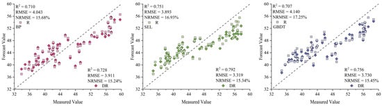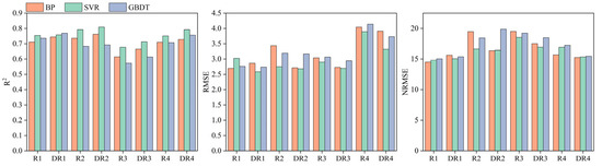 Figure 9 shows that the DR dataset consistently outperforms the R dataset across all models (SEL, BP, and GBDT) in terms of model fitting and error control. The DR dataset leads to better performance in R2, RMSE, and NRMSE, indicating its superior ability to capture data trends and produce more accurate and stable predictions.