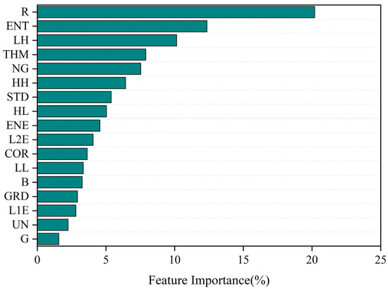 Figure 10 presents the results of the feature importance evaluation for each input feature. The results reveal that the red light parameter (R) holds the highest feature importance with a score of 20.19%. The red light parameter (R) typically refers to the characteristic parameter of vegetation when it receives and reflects light in the red spectrum, which is closely related to CHL content [19]. Entropy (ENT) ranks second with a score of 12.35%. This is because entropy is strongly associated with the leaf density and growth condition of maize plants, both of which have a significant impact on the CHL content [28]. The wavelet feature LH ranks third in importance with a score of 10.14%. Wavelet features can reflect the structure and growth conditions of maize plants. When the growth status of plant leaves is good, with a healthy leaf density and structure, the aerial images will show more distinct reflective characteristics, leading to an increase in the wavelet feature LH [24]. The importance of other features ranges from 1% to 8%, indicating that their importance is relatively low.