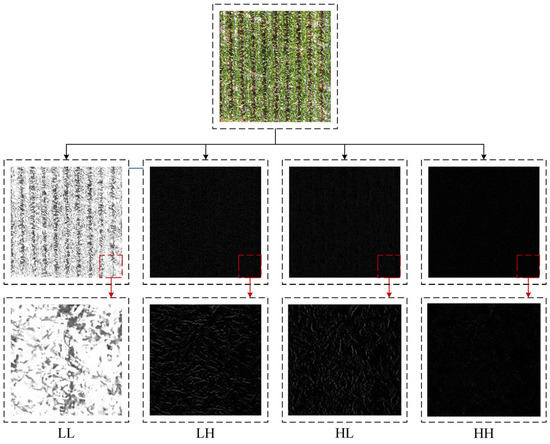 Discrete Wavelet Transform (DWT) demonstrates significant potential in agricultural remote sensing and image analysis. Using multi-resolution analysis, DWT decomposes an image into various frequency sub-bands, including the low-frequency sub-band (LL) and high-frequency sub-bands (LH, HL, and HH) [52,53]. The low-frequency sub-band encompasses overall trend information, such as brightness and large-scale structures, while the high-frequency sub-bands capture finer details, including edges and textures [54,55]. DWT effectively reduces noise and enhances image quality by separating high-frequency noise from low-frequency primary features, thereby eliminating sensor noise and preserving critical details [56]. This capability is well suited for agricultural remote sensing applications requiring high image clarity, such as the precise identification of crop canopy structures. DWT exhibits strong compression performance, enabling the reconstruction of most information by storing only a subset of critical coefficients, thereby significantly reducing data storage requirements. Furthermore, DWT can extract texture features in horizontal, vertical, and diagonal directions, facilitating precise crop–background separation or the identification of disease characteristics. DWT also demonstrates potential in multimodal feature fusion. By integrating DWT-derived multi-frequency features with color, spectral, or other texture features, it enhances feature space representation and improves the accuracy of classification or regression models.