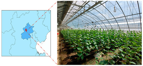 In order to accurately predict soil temperature within the cucumber greenhouse, key environmental parameters were collected from a greenhouse situated at the No. 7 planting shed of the National Precision Agriculture Research Demonstration Base in Changping District, Beijing. The experimental greenhouse is designed as a solar greenhouse, measuring 30 × 7.5 × 3 m, and is utilized for the cultivation of two cucumber crops. The overall configuration is illustrated in Figure 1. To more accurately represent the climate-change characteristics within the greenhouse, the sensor was positioned in the central area of the room, at a height of 1.5 m from the ground, 15 m from both the front and back of the greenhouse, and 3.75 m from each side. The environmental dataset for the cucumber greenhouse developed in this study encompasses data on soil temperature, soil moisture, air temperature, air humidity, light intensity, outdoor evapotranspiration, and soil salinity. All data were collected from NX-XLB01 Green Cloud Greenhouse Environmental Monitoring Equipment(Beijing Academy of Agricultural and Forestry Sciences Information Technology Research Center, Beijing, China). A total of 17,570 data items were collected at 10-min intervals, as presented in Table 1.