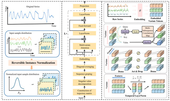 The multi-parameter greenhouse environment dataset undergoes initial processing through a preprocessing layer, during which outliers are eliminated and missing values are imputed. By determining the ideal quantity of subsequences for SSA decomposition, this approach effectively filters out data noise, thereby enhancing the model’s ability to accurately capture the features and trends inherent in the time-series data, and in turn, this enhancement improves prediction accuracy [33]. Each complete subsequence is processed through the embedding layer of the iTransformer, where the entire sequence corresponding to the same variable is converted into high-dimensional feature representations. Following the analysis of variable correlations, the RevIN method is employed to address distributional discrepancies among variables through layer normalization. Subsequently, a linear feedforward network is utilized to extract deep features from the time-series data. The learned features are projected through the projection layer to yield future prediction results for each subsequence that are ultimately aggregated to produce the overall prediction outcome. The greenhouse-environment data are characterized as a non-smooth sequence with a distribution that evolves over time, displaying pronounced long-term trends and seasonality. In the context of predicting soil temperature in cucumber greenhouses, the RevIN method preserves the benefits of conventional normalization techniques, which enhance the optimization of neural network parameters and improve generalization performance. Simultaneously, it mitigates the adverse effects associated with the direct omission of information on the predictive performance of the model. The primary workflow for predicting soil temperature in cucumber greenhouses is illustrated in Figure 4.