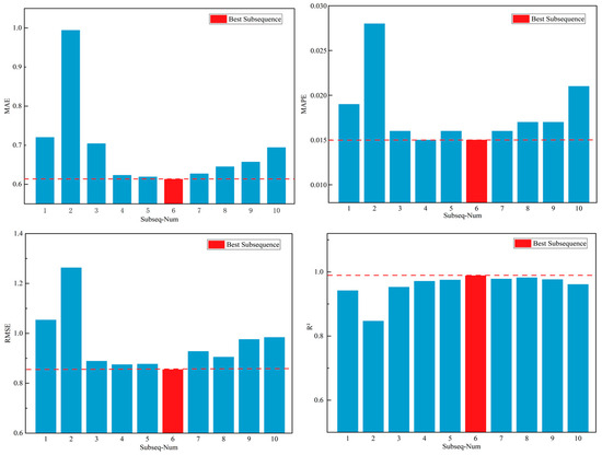 Using the SSA algorithm, the primary variable of the prediction model, namely soil temperature, is subjected to decomposition. The embedding window is established at a size of 10, and the resulting reconstructed component sequence is illustrated in Figure 5. The experimental findings are summarized in Table 2, where the optimal number of subsequences for prediction within the greenhouse dataset is emphasized in bold. Testing across multiple sliced datasets revealed that the optimal number of subsequences fluctuates across different temporal intervals. This variability is attributed to seasonal factors that exert distinct influences on soil temperature throughout the year. Consequently, this underscores the necessity for an adaptive approach to determine the optimal number of subsequences, tailored to the specific characteristics of the data. The model is capable of extracting the most significant feature information pertinent to soil temperature prediction under varying conditions. By employing this method for subsequence selection, the iTransformer prediction model attained optimal results across diverse factors within the greenhouse environmental slice data. This further corroborates the efficacy of the SSA technique. The prediction performance metrics for each decomposed subsequence are presented in Figure 6.