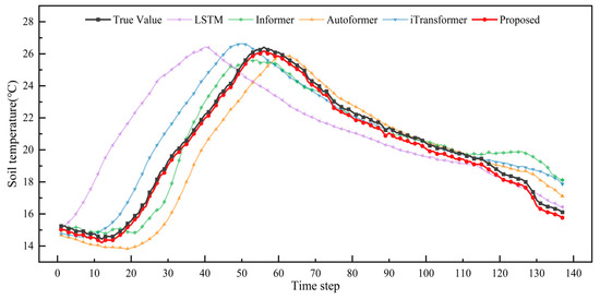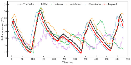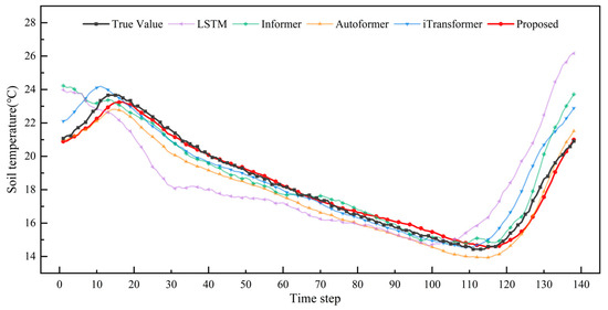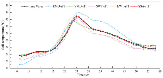 Table 3 provides a quantitative comparison of the performance of these methods within the iTransformer model, utilizing error metrics such as MAE and RMSE to emphasize differences in accuracy and computational requirements. The indicators that demonstrate the highest performance are presented in bold font. Additionally, Figure 7 illustrates a comparative analysis of the prediction outcomes of different methodologies concerning the one-hour soil temperature in cucumber greenhouses. In conclusion, the overall efficacy of the different signal decomposition techniques can be ranked as follows: EMD < VMD < SWT < EWT < SSA.