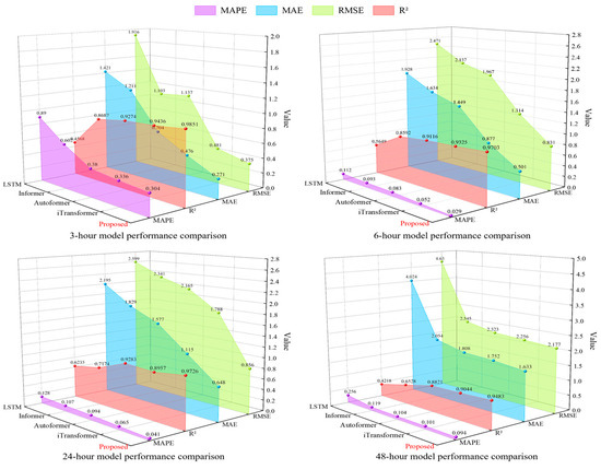 In order to offer a more intuitive representation of the accuracy of the variations associated with each method across different time steps, this paper presents charts illustrating the evaluation metrics, as depicted in Figure 12. The horizontal axis on the right shows the names of the compared models, while the left side lists the different evaluation metrics. The vertical axis represents the values of the four-evaluation metrics. Among them, lower values of MAE, MAPE, and RMSE, and higher values of R2 indicate better model performance.