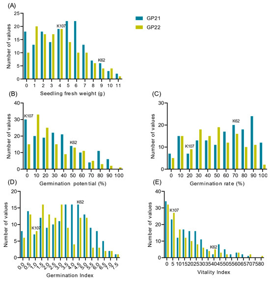 Distribution of seed artificial aging tolerance in RIL populations in 2021 and 2022. (A–E) indicate SFW, GP, GR, GI, and VI, respectively.