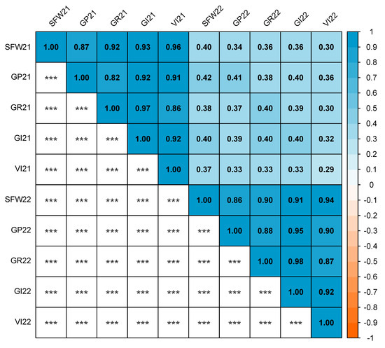 Correlation analysis of SFW, GP, GR, GI, and VI in 2021 (21) and 2022 (22). *** represents significance at the 0.001 probability level.