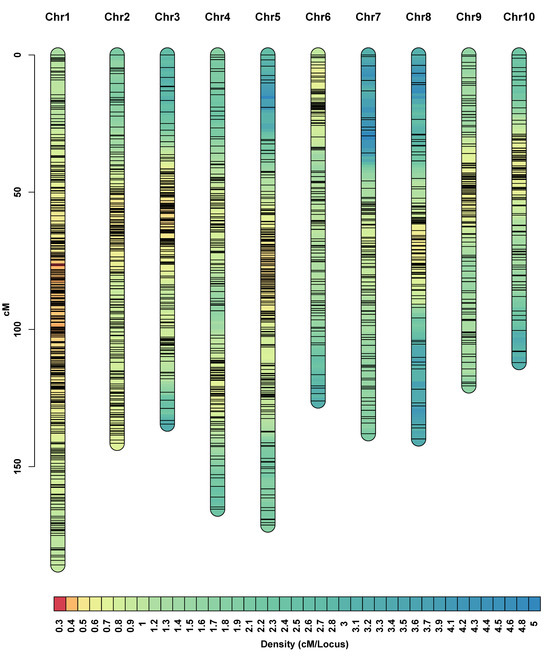 A genetic map of the RIL population. In the figure, the left side represents the genetic distance between the markers in centimorgans (cM), and the bottom side shows the density of the markers on the corresponding chromosome.
