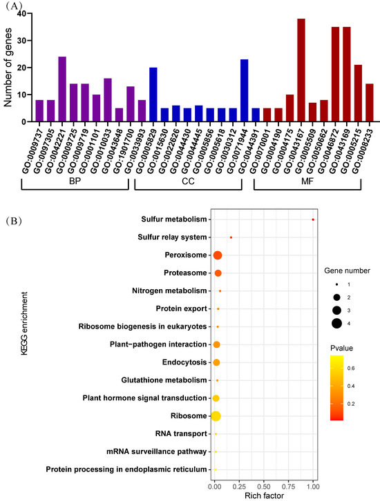 A Gene Ontology enrichment analysis revealed that these genes are associated with cellular components and molecular functions. The biological processes are primarily related to responses to abscisic acid, alcohol, chemical stimuli, hormones, endogenous stimuli, acidic chemicals, organic substances, dicarboxylic acid metabolic processes, oxygen-containing compounds, and lipids. A KEGG enrichment analysis indicated that these genes are predominantly involved in metabolic processes, such as sulfur metabolism, the sulfur relay system, peroxisomes, proteasomes, and nitrogen metabolism (Figure 4A,B).
