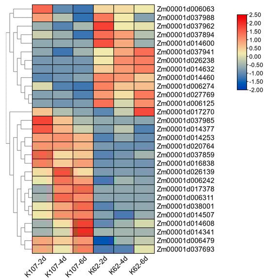 Heatmaps of 29 DEGs within QTLs in seed aging-tolerant K62 compared with seed aging-sensitive K107. The threshold of FDR < 0.05, |log2 (FC)| > 1 was used to screen DEGs between K62 and K107 after seed aging stress at 2, 4, and 6 days.