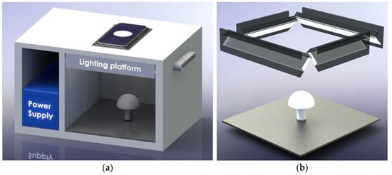 General View and Lighting System Details of the Portable Imaging Apparatus. (a) General View of the Portable Imaging Apparatus, highlighting the modular design, power supply compartment, and lighting platform setup. (b) Detailed View of the Lighting System of the Portable Imaging Apparatus, highlighting the specially designed 45-degree angled lighting channels equipped with diffusers to minimize glare and ensure uniform illumination, specifically tailored for optimal imaging conditions of the mushroom specimen.