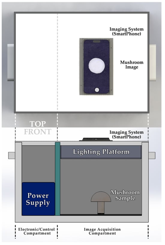 Top and Front View of the Custom Portable Imaging Apparatus, illustrating the internal lighting platform, smartphone-based imaging system, and mushroom placement.