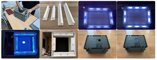 The apparatus’ modular design, as presented in Figure 1, includes clearly defined compartments for lighting and imaging systems, ensuring minimal interference and consistent, high-quality image acquisition. These carefully implemented measures enabled reliable dataset creation across diverse farming settings, establishing a robust basis for training and evaluating machine learning models. The development process of the portable imaging apparatus designed within the scope of this study is presented in Figure 3.