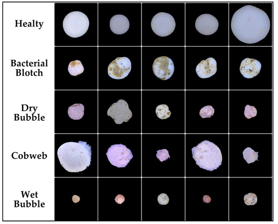 Example Images of Agaricus bisporus Classes (Healthy, Bacterial Blotch, Dry Bubble, Cobweb, Wet Bubble), Captured Under Controlled Conditions for Dataset Creation.