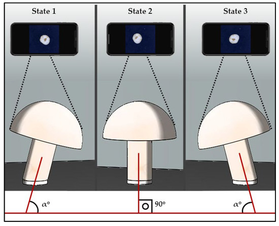 The interior surfaces of the imaging device were coated with matte black bases and matte white walls to optimize lighting quality by reducing glare and reflections [56]. Adjustable lighting channels equipped with white diffusers provided homogeneous illumination, while a consistent 45° angle of light incidence minimized specular reflections and enhanced the visibility of critical features required for accurate disease classification [57,58]. The mushroom samples were positioned on a sturdy matte black felt background to maintain consistent visual context, which is visible in the imaging setup in Figure 2 and Figure 3.