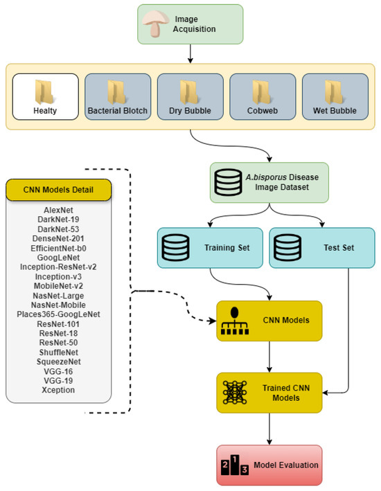 Workflow Diagram for Agaricus bisporus Disease Classification: From Image Acquisition to Model Evaluation Using CNN Architectures.