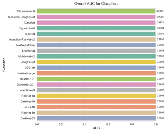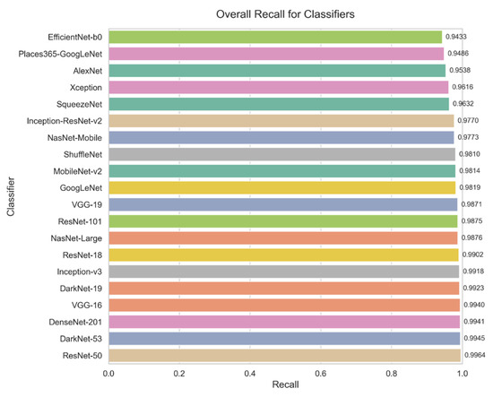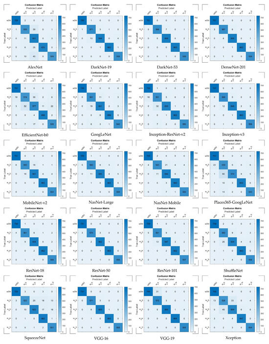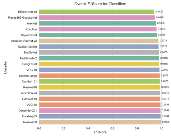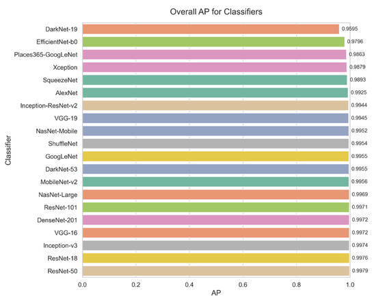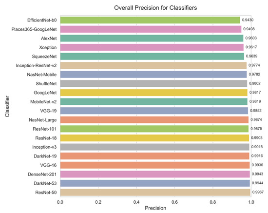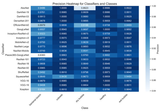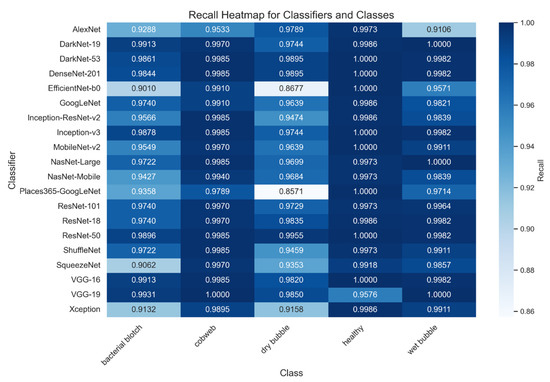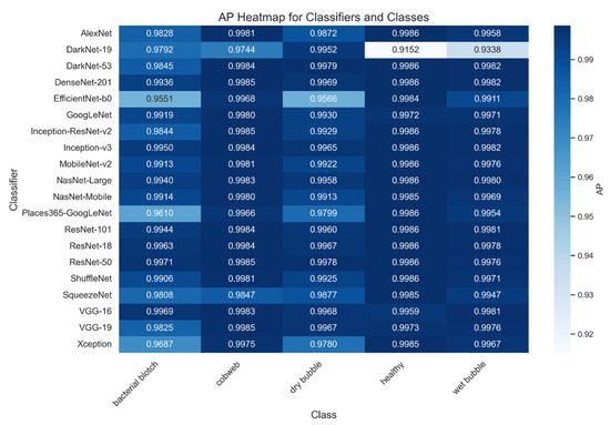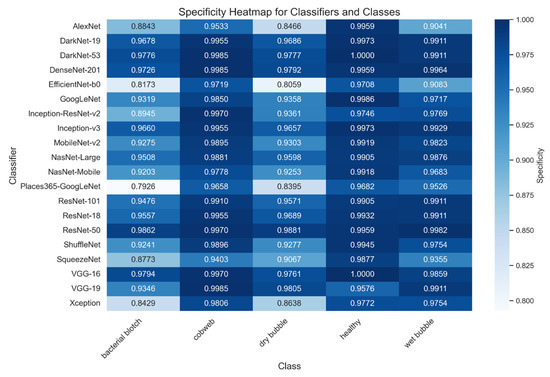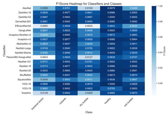 The performance of the evaluated Convolutional Neural Network (CNN) architectures is summarized in Table 2. Among the 20 architectures assessed, ResNet-50 achieved the highest overall score of 99.70%, demonstrating exceptional accuracy and reliability across all disease categories. DenseNet-201 and DarkNet-53 closely followed, confirming their robustness in precision and recall, making them among the top-performing models. EfficientNet-b0 and Places365-GoogLeNet, on the other hand, were the models with the lowest performance. EfficientNet-b0 achieved a score of 95.20%, offering a balanced trade-off between computational efficiency and accuracy. While VGG-16 was excluded from final evaluations due to overfitting issues, despite its initial high scores [62].