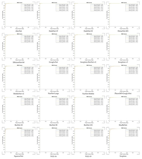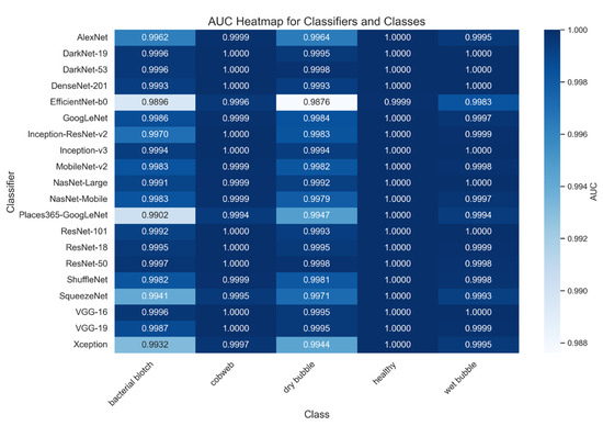 Area Under the ROC Curve (AUC) (10%): AUC assesses the model’s ability to discriminate between classes across various threshold settings. It provides an aggregate measure of performance across all classification thresholds, indicating the model’s overall ability to distinguish between diseased and healthy mushrooms [66,67].