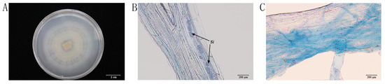 The colony morphology of S. indica and the microscopic examination of the root system. (A) The colony morphology of S. indica; (B) colonized roots; (C) uncolonized roots; Si: Serendipita indica.