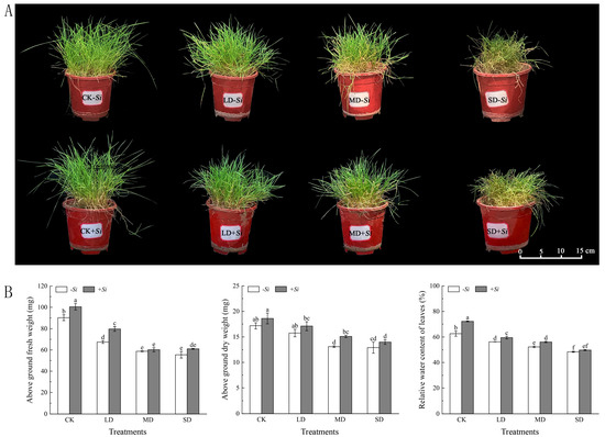 Under normal conditions, the fresh weight and leaf relative water content (RWC) of A. stolonifera inoculated with S. indica were significantly higher by 11.4% and 15.3%, respectively, compared to the non-inoculated group. Drought stress inhibited growth, with both fresh and dry weights, as well as the leaf RWC, decreasing as stress levels increased. However, S. indica inoculation mitigated the decline in the aboveground biomass under equivalent stress conditions. For example, in the LD + Si group, the fresh weight and leaf RWC increased by 18.3% and 5.8%, respectively, compared to the LD − Si group. Similar trends were observed under moderate drought stress, where the dry weight of the aboveground portion and leaf RWC increasing by 15.3% and 7.3%, respectively. Although the aboveground biomass in the SD + Si group was greater than that in the SD − Si group, the difference was not statistically significant.