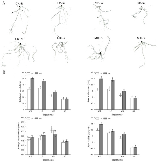 Effects of different treatments on the root morphology and development of A. stolonifera. (A) The root morphology of plants. (B) The total root length, root surface area, average root diameter, and root vitality of A. stolonifera under different treatments. The data are presented as the means ± SEs (n = 5); different letters above the bars indicate significant (p < 0.05) differences. Abbreviations: Si—Serendipita indica, CK—normal moisture management at 70–75% of the field capacity, LD—low drought stress at 55–60% of the field capacity, MD—moderate drought stress at 40–45% of the field capacity, SD—severe drought stress at 25–30% of the field capacity.