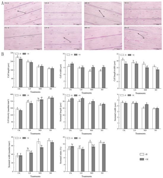 Effects of different treatments on lower epidermal characteristics of A. stolonifera leaves. (A) Lower epidermal structure of the leaves under a light microscope. (B) Parameters (length, width, and density) related to lower epidermal cells and stomata. The data are presented as the means ± SEs (n = 30); different letters above the bars indicate significant (p < 0.05) differences. Abbreviations: Lc—long cells, St—stomata, Sc—short cells, Si—Serendipita indica, CK—normal moisture management at 70–75% of the field capacity, LD—low drought stress at 55–60% of the field capacity, MD—moderate drought stress at 40–45% of the field capacity, SD—severe drought stress at 25–30% of the field capacity.