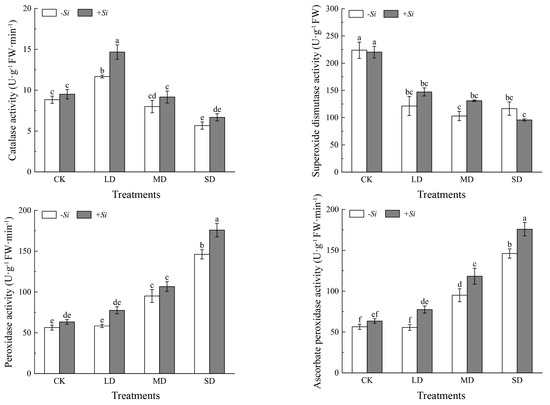 Effects of different treatments on antioxidant enzyme (CAT, SOD, POD, and APX) activities in A. stolonifera. The data are presented as the means ± SEs (n = 3); different letters above the bars indicate significant (p < 0.05) differences. Abbreviations: Si—Serendipita indica, CK—normal moisture management at 70–75% of the field capacity, LD—low drought stress at 55–60% of the field capacity, MD—moderate drought stress at 40–45% of the field capacity, SD—severe drought stress at 25–30% of the field capacity.