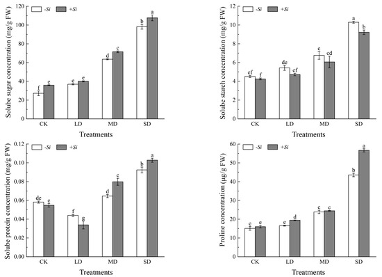 Effects of different treatments on osmotic regulatory substances (soluble sugar, soluble starch, soluble protein, and proline concentrations) in A. stolonifera. The data are presented as the means ± SEs (n = 3); different letters above the bars indicate significant (p < 0.05) differences. Abbreviations: Si—Serendipita indica, CK—normal moisture management at 70–75% of the field capacity, LD—low drought stress at 55–60% of the field capacity, MD—moderate drought stress at 40–45% of the field capacity, SD—severe drought at 25–30% of the field capacity.