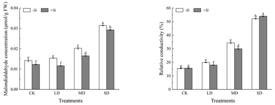 Drought stress destroys plant cells, leading to cytoplasmic leakage, which is indicated by an elevated MDA content and increased relative conductivity [35]. As shown in Figure 8, under normal conditions, the MDA content in the CK + Si group was significantly reduced by 13.4% compared to the CK − Si group. As the soil moisture content decreased, the MDA content and leaf relative conductivity increased, with the MD − Si group showing significant increases of 31.4% and 72.3%, respectively, compared to the LD − Si group. Moreover, the SD − Si group exhibited increases of 55.4% and 52.0%, respectively, compared to the MD − Si group. Inoculation with S. indica significantly reduced the MDA content and relative conductivity under equivalent stress conditions. Specifically, the LD + Si group showed reductions of 24.5% and 9.8%, respectively, compared to the LD − Si group. Similar trends were observed under moderate and severe drought stresses.