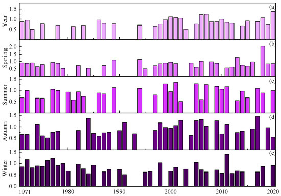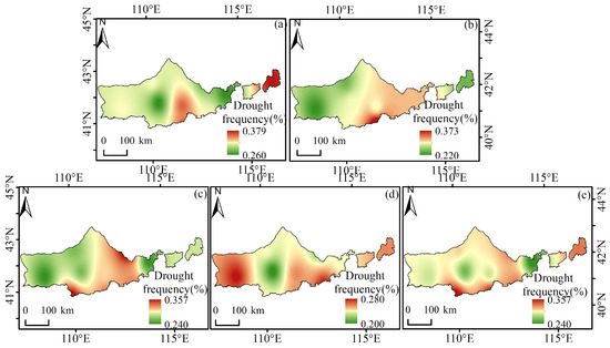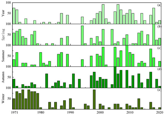 - The average reduction rates of the SPEI-3 and SPEI-12 in Yinshanbeilu from 1971 to 2020 were 0.091 and 0.065 yr−1, respectively, and the overall trend of drought conditions was aggravated. The annual drought frequency was high in the central and eastern parts of China, the annual-scale drought station ratio exhibited an increasing trend, and the overall trend of the drought intensity was basically consistent with the drought station ratio.
