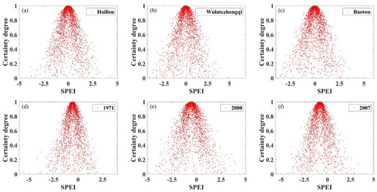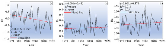 - Cloud characterization revealed that Ex followed a decreasing trend, En and He showed an increasing trend, He exhibited a significant increasing trend, the deterministic nature of the SPEI was relatively easy to determine, and the drought distribution based on the SPEI was the most heterogeneous and remained the least stable.