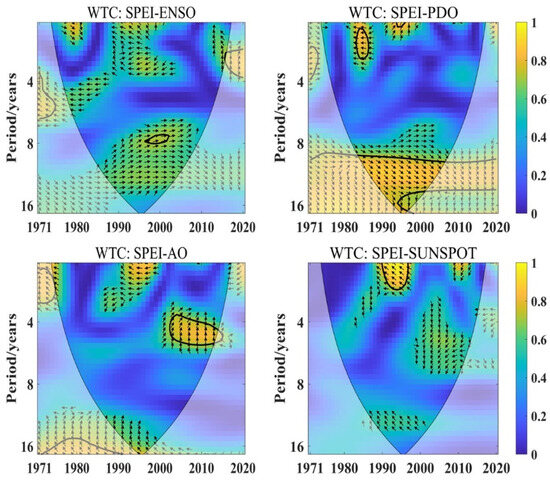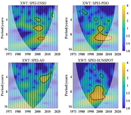 - There were resonance cycles between the SPEI and the remote correlation factors, in which the PDO and ENSO exhibited more obvious resonance interactions with the SPEI, indicating that these remote correlation factors greatly contribute to a decrease in the SPEI.