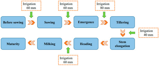 Before sowing, the field was plowed with a tooth harrow, and 10 kg P ha−1 (Sierte Fertlizer Industry Co., Ltd., Ningguo, China), 25 kg K ha−1 (Asia-Potash International Investment Co., Ltd., Guangzhou, China), and 160 kg N ha−1 were applied manually in all plots. The nitrogen source was 15N-labeled urea (10% enrichment and 46% nitrogen content) (Guangzheng Chemical Co., Ltd., Dongying, China), broadcast manually and incorporated into the soil through plowing to ensure uniform distribution and minimize volatilization. Fungicides (Propiconazole, Sinochem International, Beijing, China) and insecticides (Imidacloprid, China National Chemical Co., Beijing, China) were applied for disease and insect control, and weeds were manually removed throughout the growing season. The irrigation method used in this study was flood irrigation, a common practice in the Hexi Corridor region of China. The irrigation water was sourced from a local canal network fed by melted snow and rainfall, typical of arid regions near the Tengger desert. Water quality was monitored, with salinity levels below 0.4 dS m−1, meeting the standard for agricultural irrigation, and nitrogen concentrations were negligible (<0.2 mg L−1), ensuring minimal contribution to plant nitrogen uptake. In this study, irrigation water was uniformly applied across the treatment plots using channels designed to direct water flow evenly. Irrigation was carried out at critical growth stages of spring wheat—emergence, tillering, stem elongation, and milking. A total irrigation volume of 300 mm was applied over the growing season, aligning with the average evapotranspiration for spring wheat in the region, which is approximately 220.3 mm [27,28]. The yield of crops is closely related to the sensitivity of plants to water stress at different growth stages (Figure 1) [24,29,30]. High soil available water typically promotes tillering in spring wheat, which is particularly sensitive from tillering to the milking and maturity stages [31]. The total cost of plastic mulch placement varied according to the depth of burial (DFBT). Information on the cost of installing the film, the effect of depth on the cost, and detailed information on the increased production required to balance these costs is in Supplementary Materials Table S4.